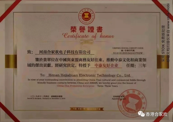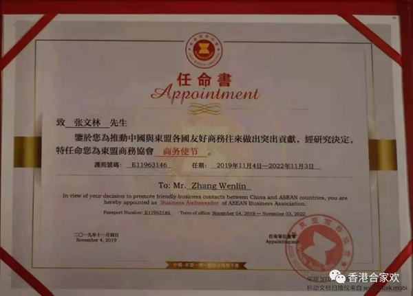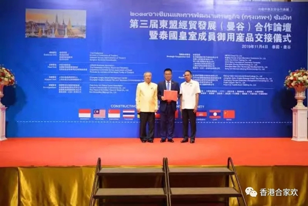 2019年11月4日,河南合家歡集團(tuán)董事長受邀參加2019“一帶一路”東盟經(jīng)貿(mào)合作(泰國)論壇暨皇 室成員御用產(chǎn)品交接儀式,活動儀式在泰國曼谷國家會議中心舉行,百余名中泰政商賢達(dá)、泰華精英共襄盛舉、洽商交流,開啟中泰經(jīng)貿(mào)合作新篇。河南合家歡集團(tuán)董事長張文林先生被授予“中泰友好使者”榮譽(yù)稱號,并被特聘為東盟商務(wù)協(xié)會商務(wù)代表。